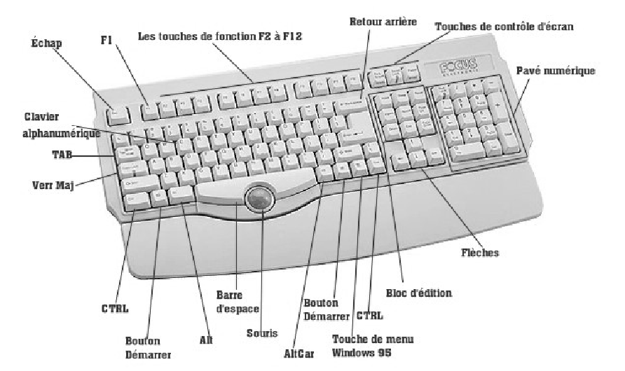 Le clavier est un périphérique d’entrée (figure suivante). Il vous permet d’entrer du texte, des chiffres ou des commandes dans votre ordinateur. Il peut être AZERTY, QWERTY ou autre. On désigne par ces noms les “langues” des claviers dont les français ou anglais dont les premières touches sont A,Z,E,R,T,Y et Q,W,E,R,T,Y.