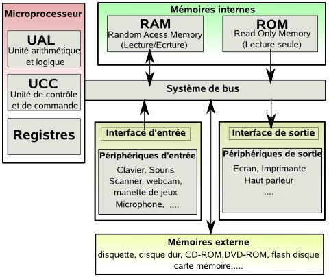 - les dispositifs d’entrée-sortie, qui permettent de communiquer avec le monde extérieur.