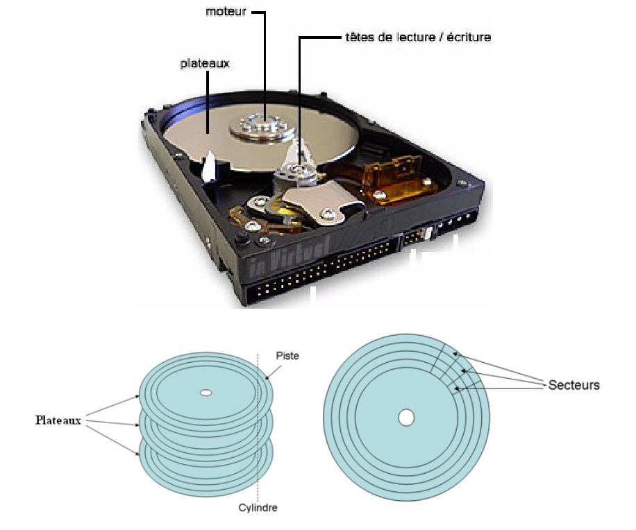 Chaque plateau est composé de pistes concentriques. Les pistes situées à un même rayon forment un cylindre. Les pistes sont ensuite découpées en secteurs qui sont l’unité élémentaire de stockage et dont la taille est de 512 octets. Les caractéristiques principales d’un disque dur sont les suivantes: